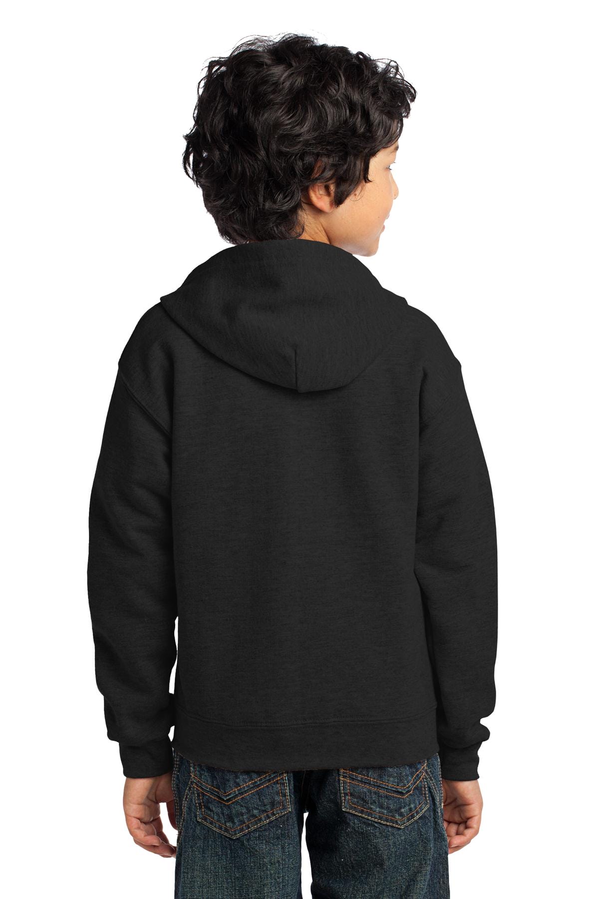 8-ounce, 50/50 US cotton/poly Unlined hood No drawcords Front pouch pockets Overlapping fabric across plastic zipper for full frontal printing 1×1 rib with spandex for enhanced stretch and recovery Classic fit, seamless body Recycled, high-performing black tear-away label